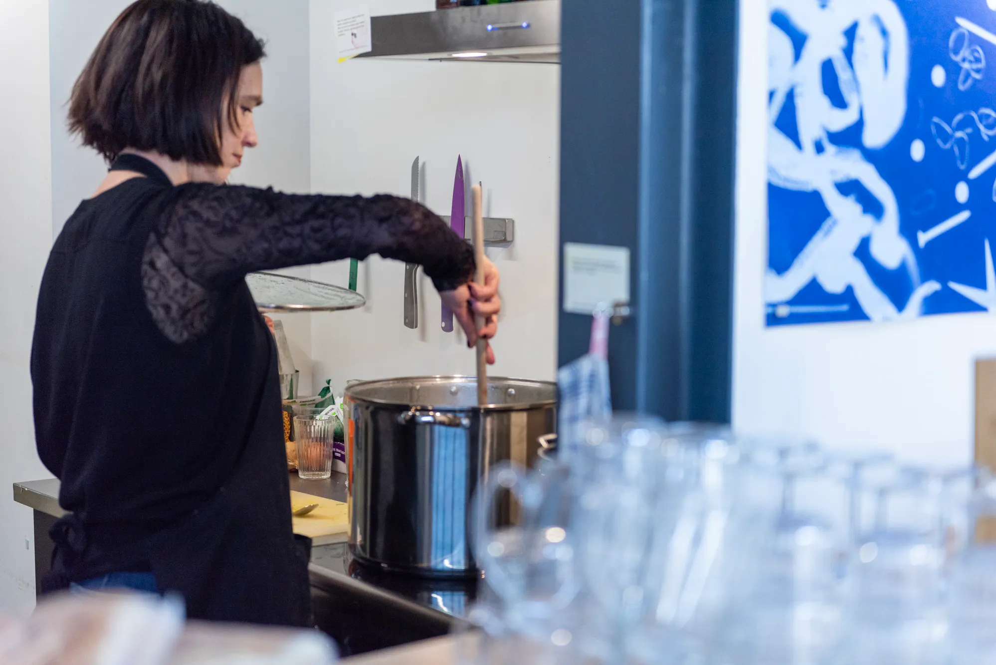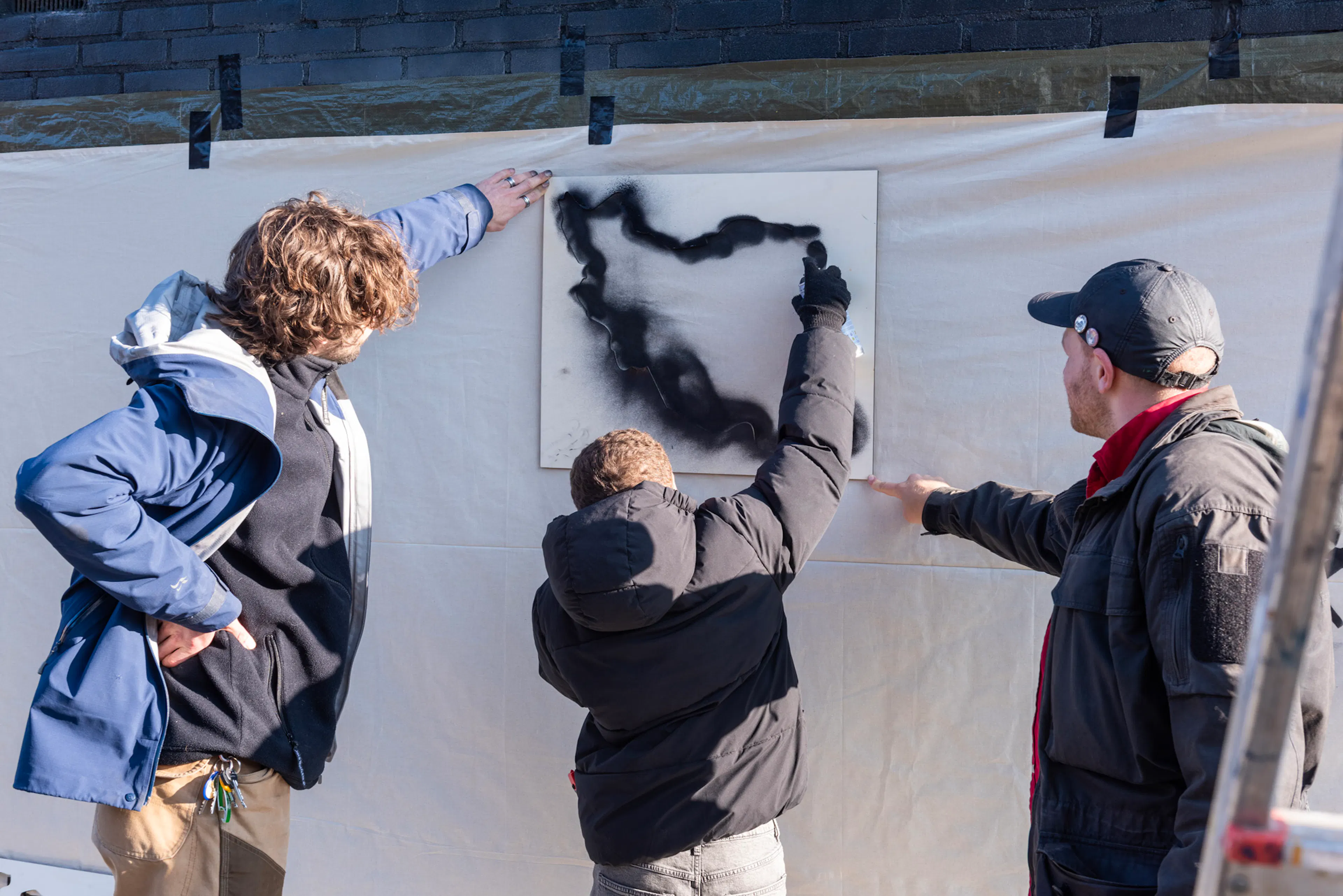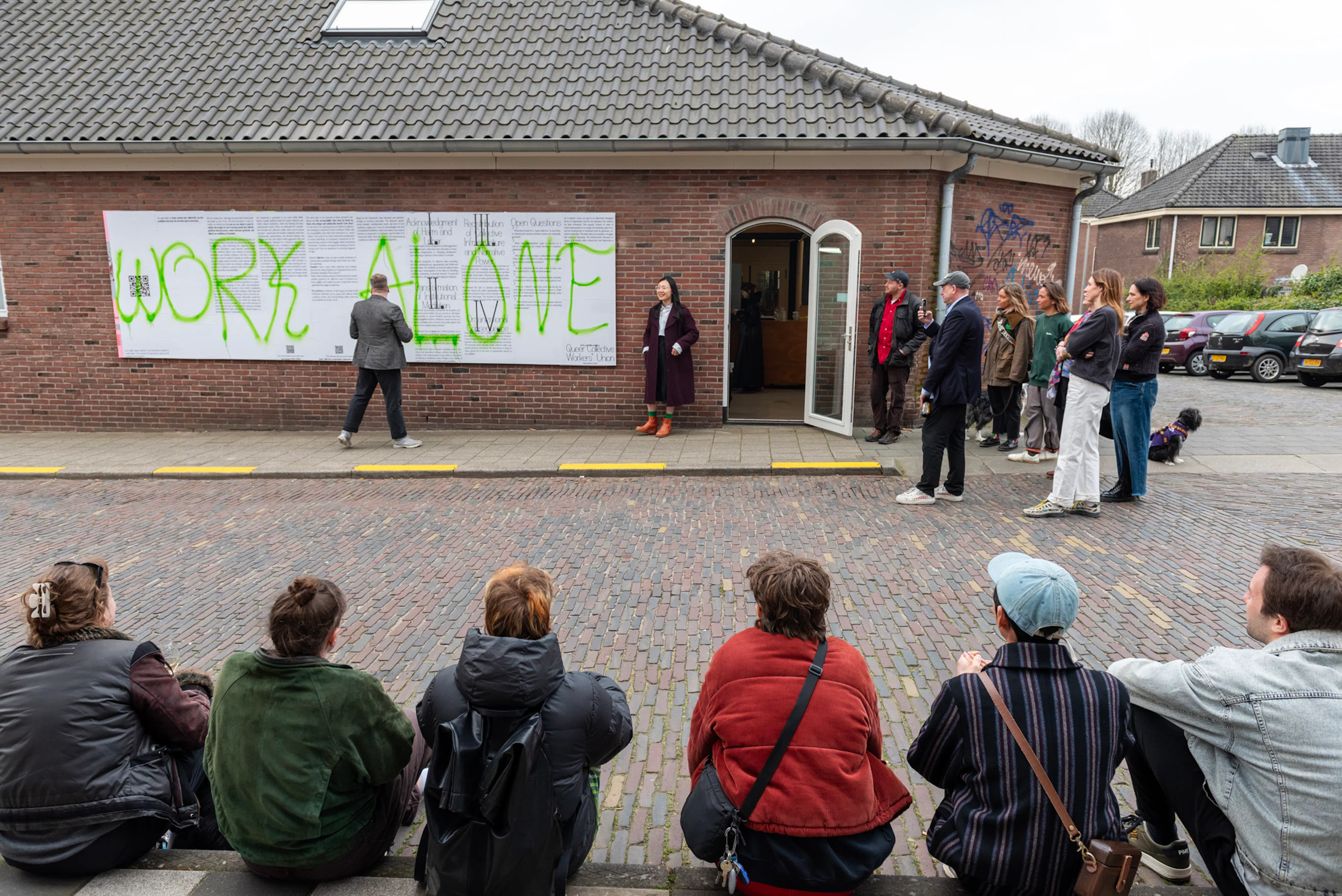 Tijdens de Lentesamenscholing vierden de nieuwe werken plus de lente én Iraans Nieuwjaar door de voordracht van Merel. We serveerden Iraanse soep en er was een inloopworkshop waarin deelnemers zich konden uiten over de oorlog in het Midden-Oosten. In de kelder kon je met je telefoonlampje op zoek gaan naar de boodschappen die Jivan met reflecterende inkt op haar werk had aangebracht. Daarna keken we naar hoe Queer Collective Workers’ Union met een groene spuitbus ‘Work Alone’ aanbracht op het billboard, terwijl ze hun oprichtingsbrief voorlazen.