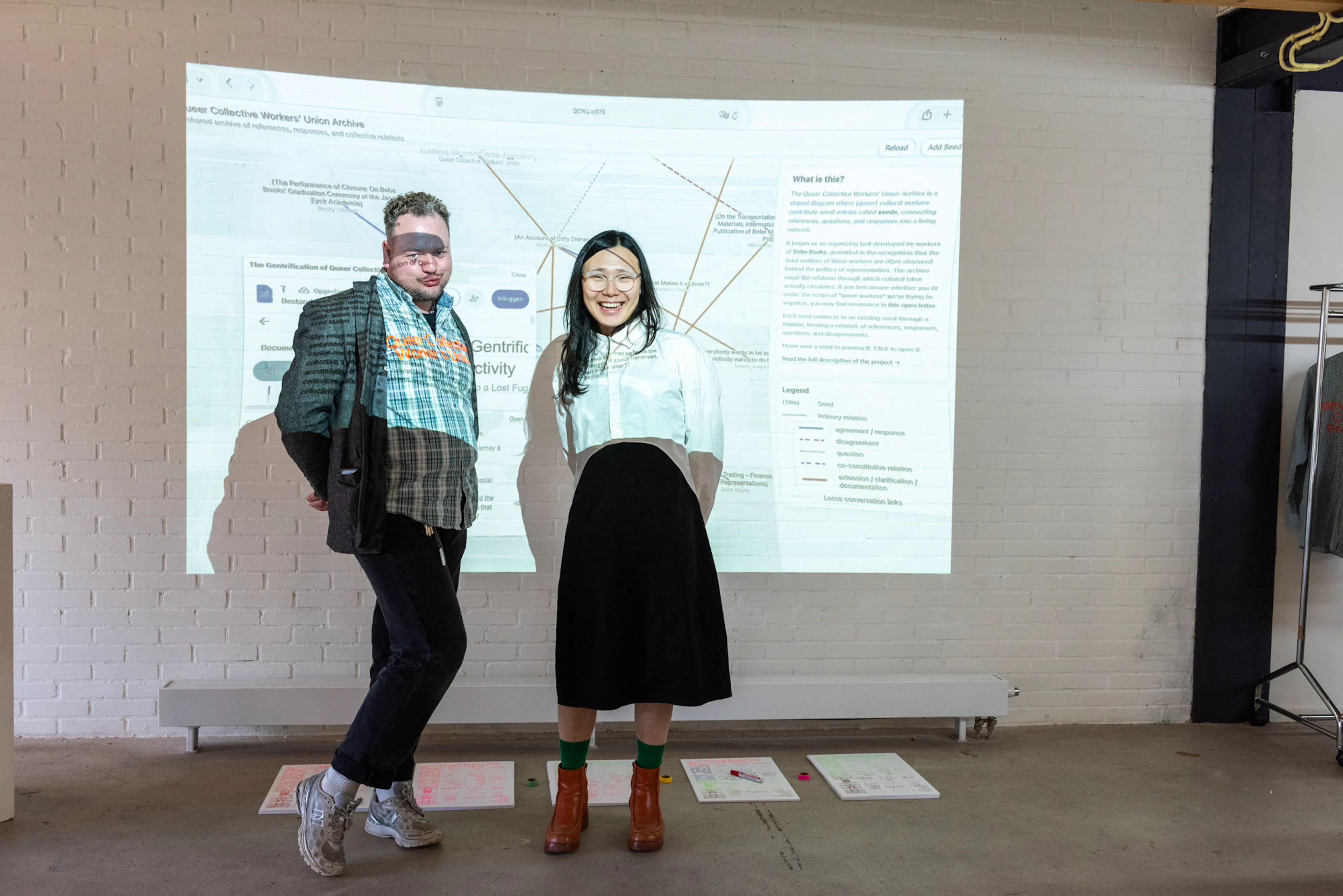 Merel maakte zines waarin ze tekst, cyanotype en zeefdruk combineerde. Jivan van der Ende gaf zich over aan haar fascinatie voor reflecterende werkkleding. Queer Collective Workers' Union presenteert hun oprichtingsbrief op een billboard, gebaseerd op de tegenstrijdigheid: een collectief dat van werknemers eist dat ze ‘alleen werken’.