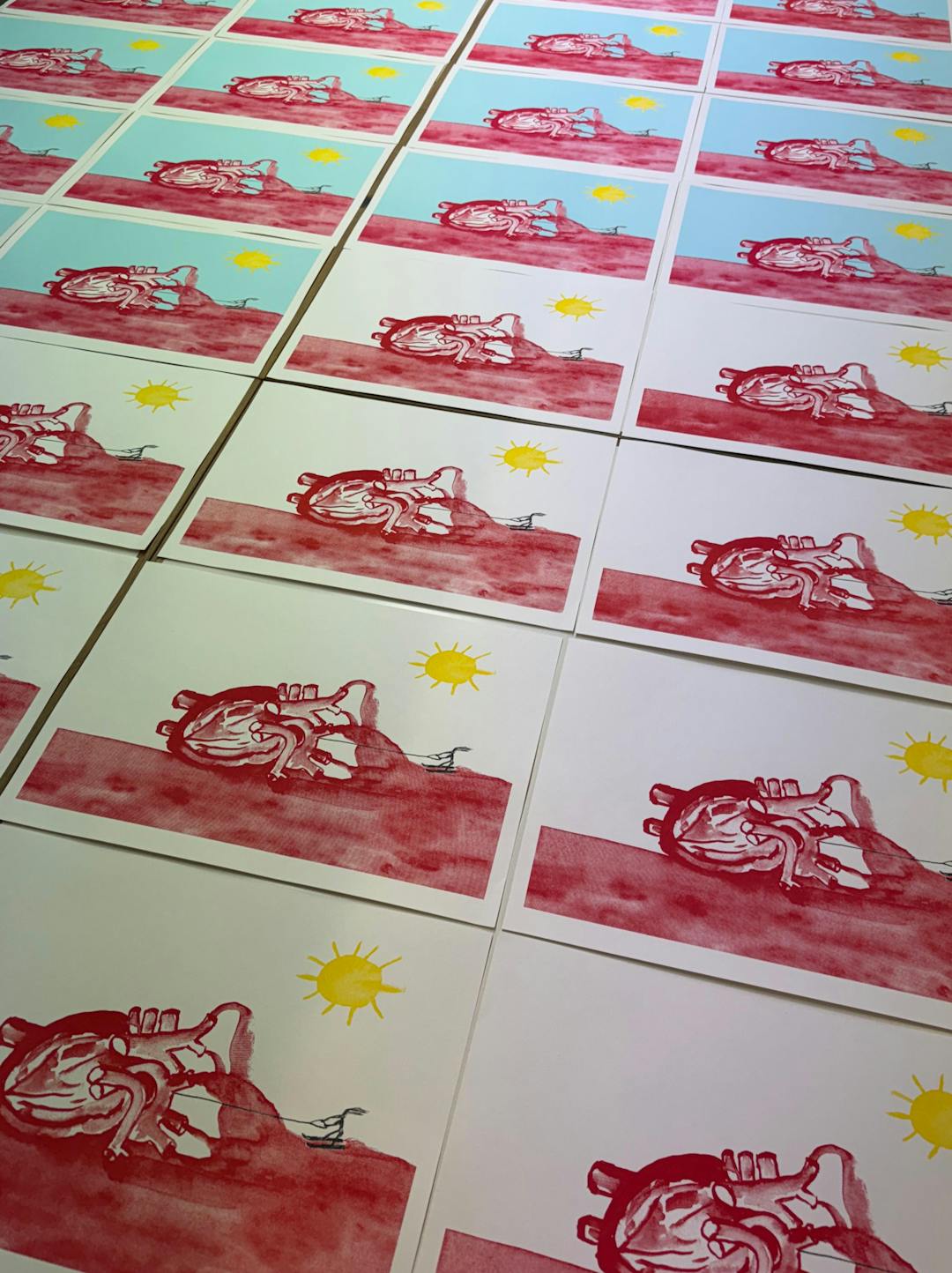 De zeefdruk heeft een dubbelzijdig ontwerp: de ene zijde toont een blauwe lucht, de andere een witte.